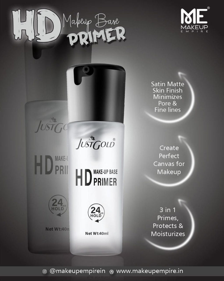 The JustGold HD Base Primer is a high-definition makeup primer designed to create a flawless base for foundation application. This primer smooths out the skin's surface, minimizing the appearance of pores and fine lines for a more even complexion. Its lightweight formula ensures long-lasting makeup wear while providing a soft, velvety finish. Ideal for all skin types, it enhances the vibrancy of your makeup and helps it stay in place throughout the day